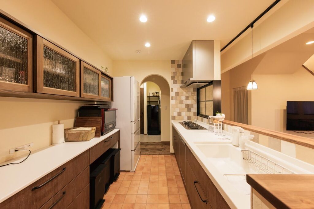 このキッチン背面にある吊戸棚は細かな寸法やガラスの種類まで細かく決めて職人さんが作ったオーダーメイドです。