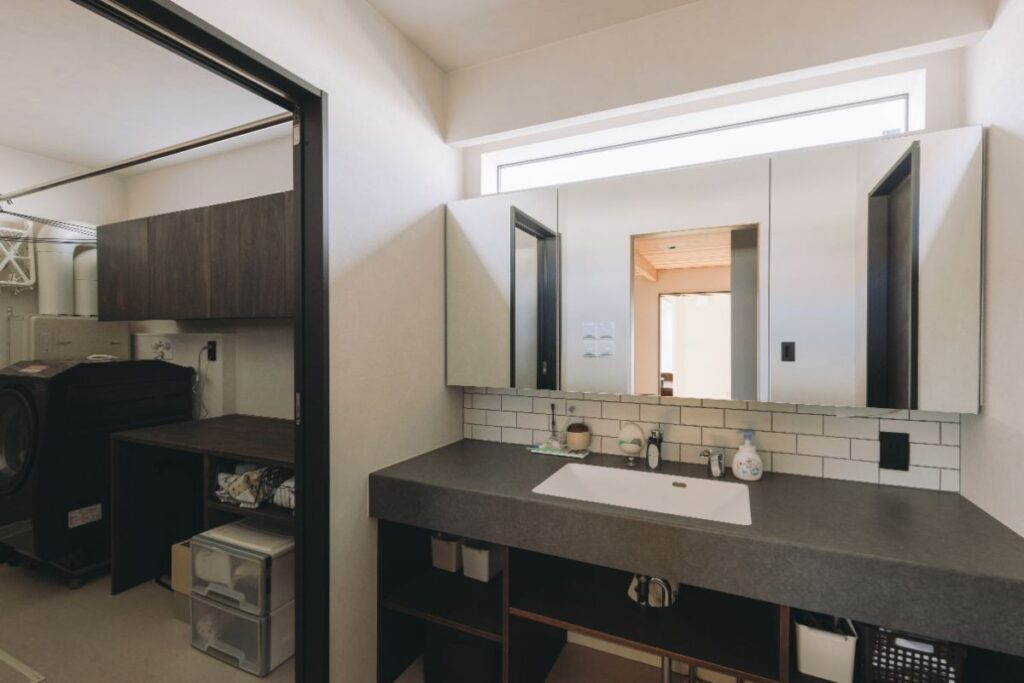 洗面所は、洗面台も鏡部分も造作で作りました。タイルは数あるサブウェイタイルの中でもツヤがないタイプ。水垢が目立たずお手入れも簡単です。