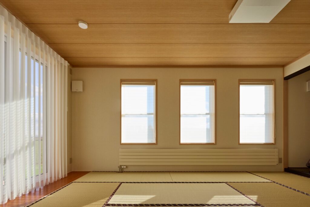 玄関横に和室を確保し来客対応もしやすくなります。床の間と仏壇も配置し落ち着いた、明るい空間になりました。