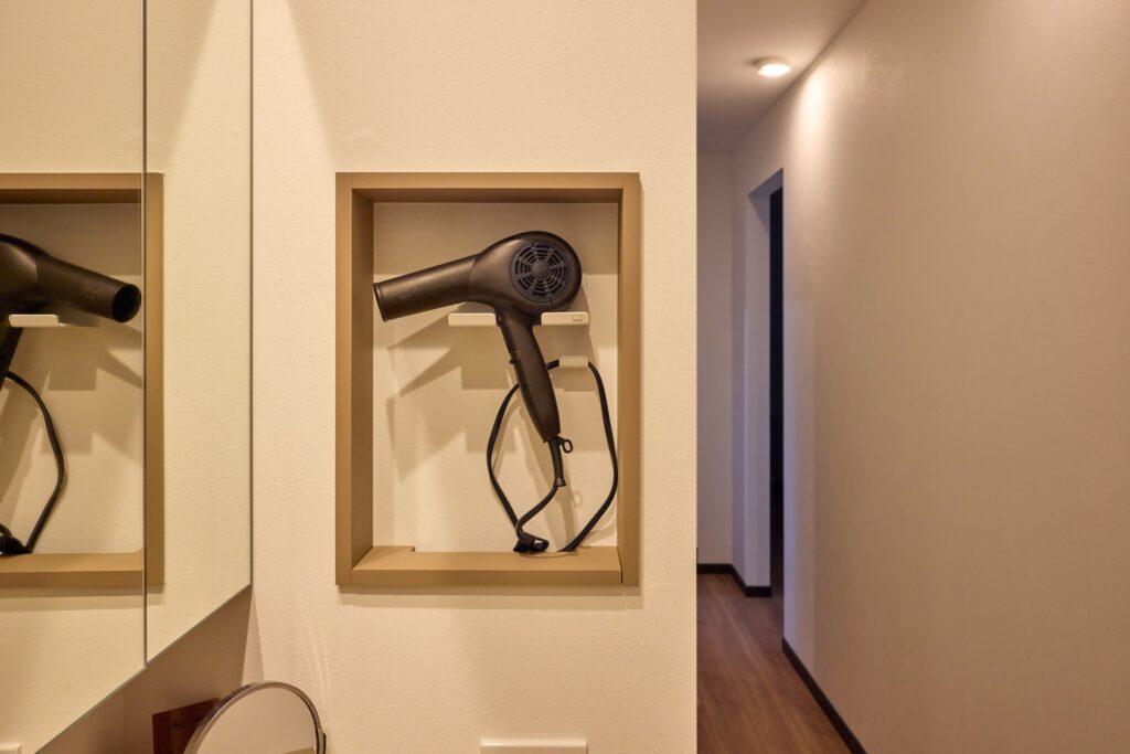 洗面台は、椅子に座ってメイクやスキンケアができるスペースも確保。