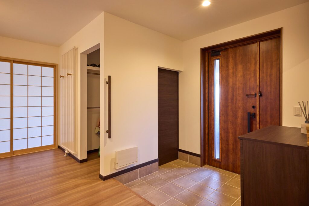 玄関ホール。ウォークインクローゼットは十分な収納量を確保し、その横には和室が…。