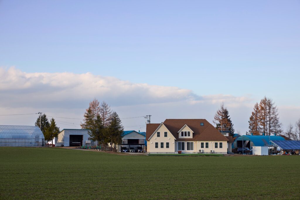訪れたのは11月上旬です。秋まき小麦の芽が大きくなり、ゆるやかな起伏のある畑を美しい緑に染めています。Wさまは農家の3代目。広大な農地の中に大きな屋根が目立つ住まいがあります。