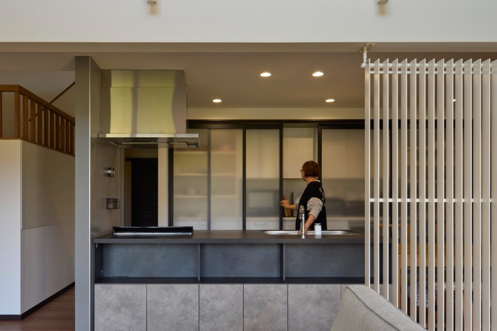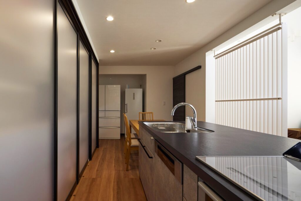 キッチンの背面は、大容量の収納空間。半透明な扉ですっぽり覆うので、キッチン廻りがすっきり片付きます。
