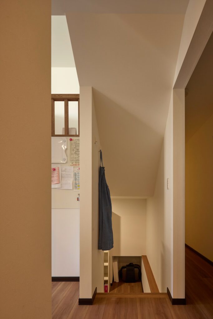 キッチン横には、階段や中2階の下部分を活用した半地下のパントリー(食品庫)もあります。