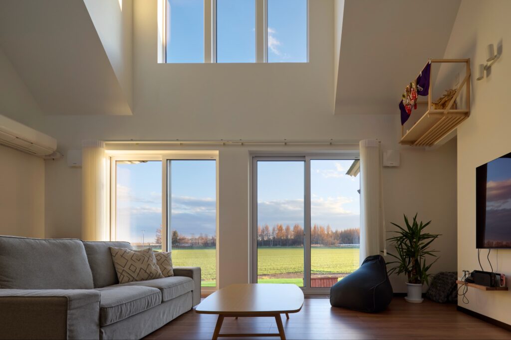 吹き抜けと高窓があるリビング。青空と畑を遠くまで眺められる贅沢なひとときを満喫できます。